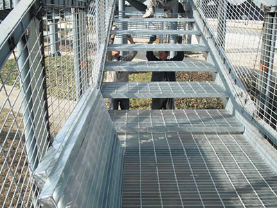 樓梯鋼格闆是由鋼格闆加工而成的(鋼格闆是用扁鋼按照一定的間距和橫杆進行交叉排列,並(bìng)且焊接成中間帶有方形格子的一種鋼鐵制品)。該産(chǎn)品表面一般用熱鍍鋅、電鍍鋅處理。